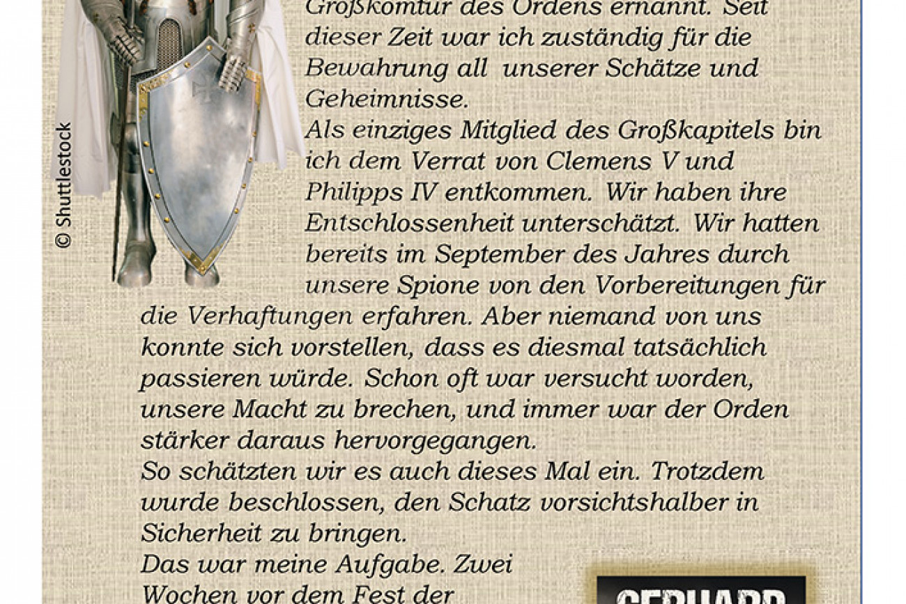 Neben der historischen Bedeutung des Fundes birgt das Protokoll für Eingeweihte noch eine weitere Sensation: die erste Spur des bei der Zerschlagung des Ordens verschwundenen Templerschatzes und der sogenannten „Seele der Templer“ einem legendären, mystischen Heiligtum.